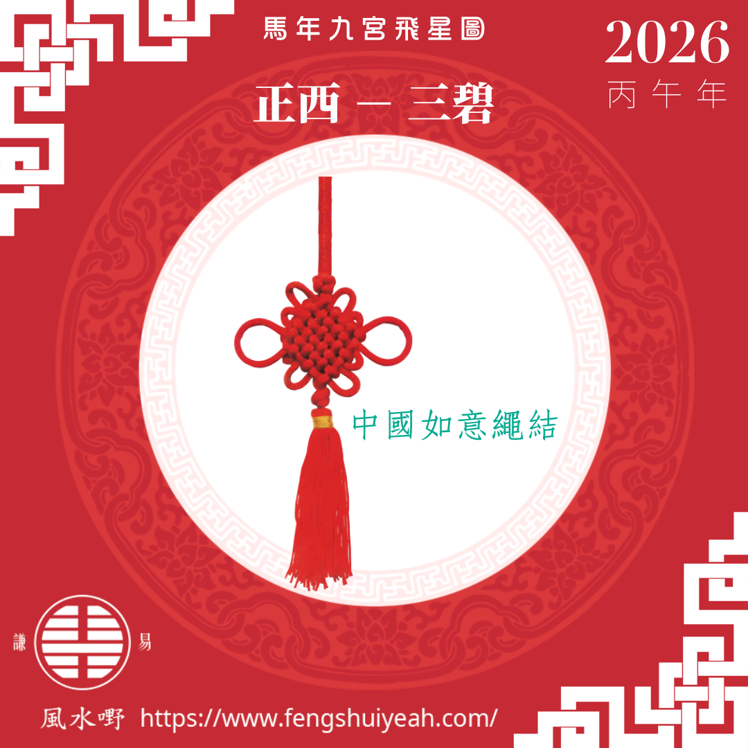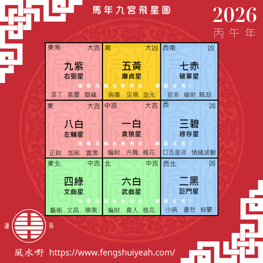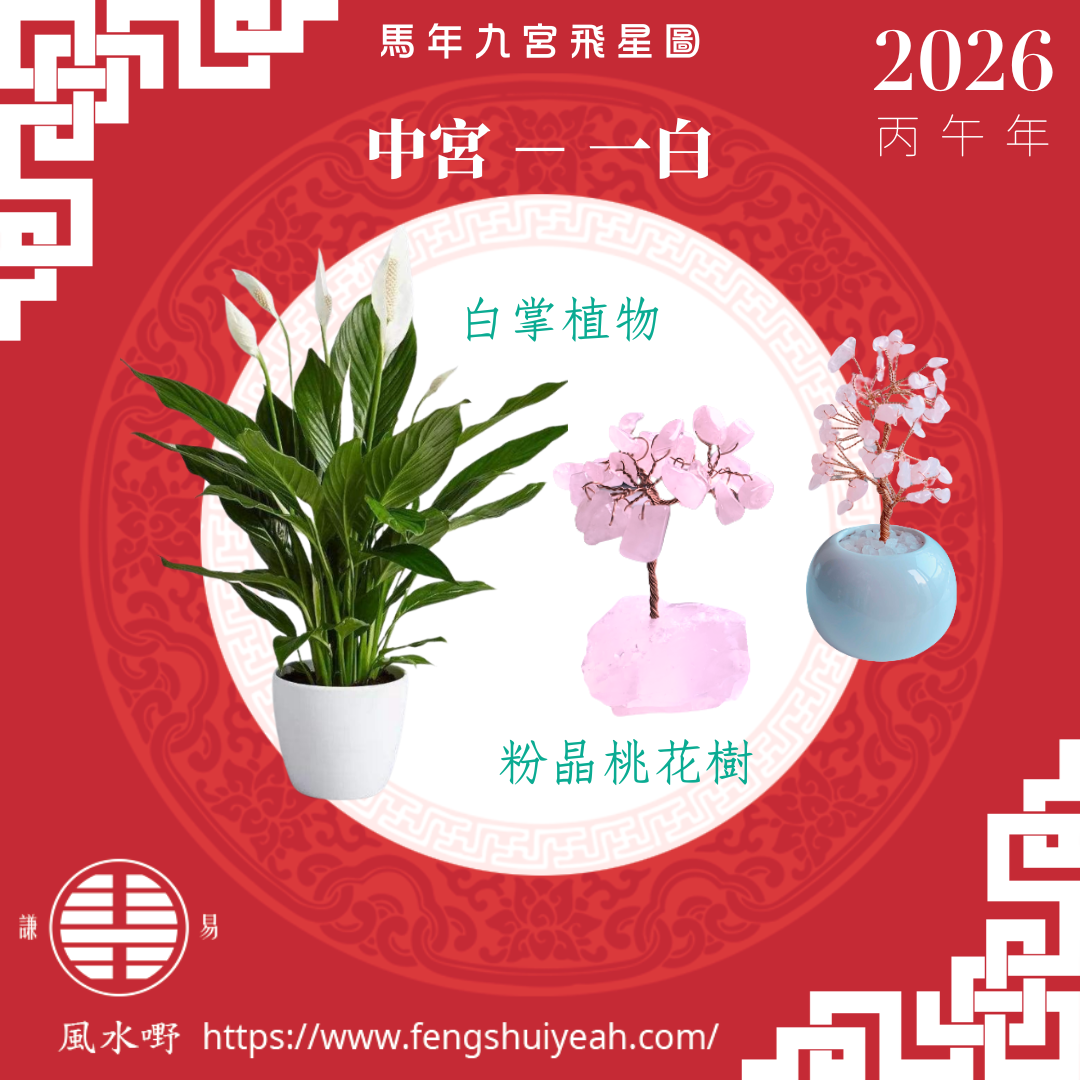 於2026年一白入中宮,與原局五黃同宮。一白屬水而五黃屬土,土剋水乃一五「子癸生傷」。此宮位有利人緣桃花,但是其性質亦吉亦凶,如家中的睡房、書房或客廳是位於全屋的中央,便要多加注意,因桃花帶煞,女性容易患婦女病,而男性則容易有外遇。另外,耳朵五行屬水,所以長期於此方位逗留,耳朵會較容易出現毛病,例如中耳炎等。一白在中宮依然帶有偏財和升遷的機會,如果你是坐在辦公室所屬部門的中宮位置,便有機會職位提升。最適宜擺放金色物品,例如金黃色地顫,心形音樂盒或金屬擺設在屋的中間位置。不但可增強偏財和桃花運,有助人際關係,同時亦可化解桃花煞。另外「一加二五,傷及壯丁。」在丙午馬年中,當流月的二黑病符星同時進入中宮,會引發五黃二黑災病產生,會影響家中的中年男性,運勢轉弱,亦會導致健康轉差,容易有手腳損傷或嚴重的災禍。以流月飛星計算,二黑在2026年的農曆七月飛臨中宮,所以必需注意家中的中年男性的健康。