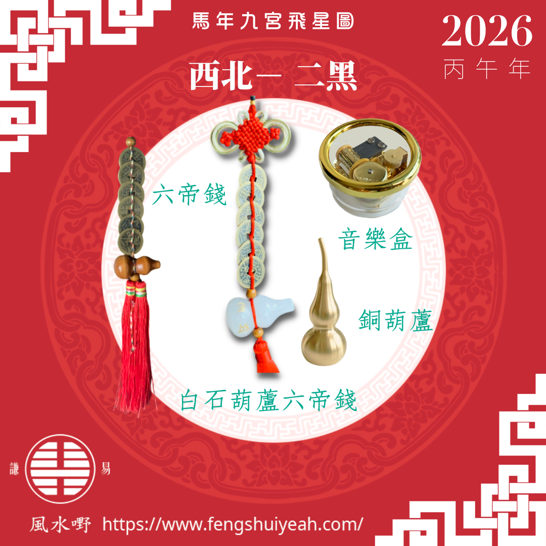 二黑入西北方,與原局六白同宮,二黑土遇六白金。二黑代表病符,屬於小病和情緒抑鬱,如家中的睡房在此宮位,會較容易患病和受到精神困擾。六白為乾為父,代表家中的男性和父親,如果睡房是位於此宮,便對健康有較大的影響。如果是書房或辦公桌,便會容易遭受精神壓力而導致情緒起伏不定。建議擺放六帝錢於此宮化洩土氣,減低患病的風險和舒緩情緒。